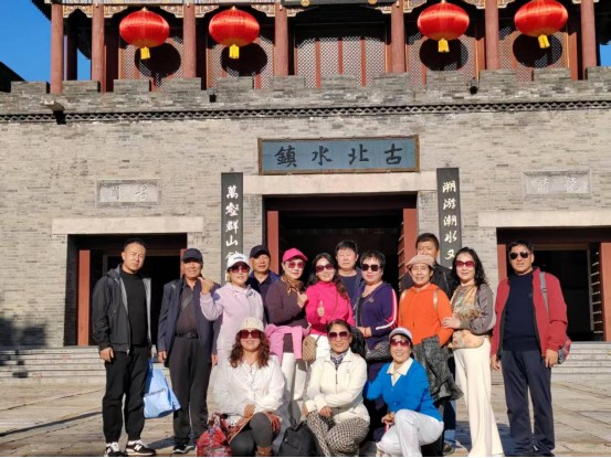 刚进景区大门,错落有致的古色古香亭台楼阁、依山傍水的湖光山色、穿镇而过的潺潺流水,瞬间让众人眼前一亮。“京师锁钥”城门前,“万壑群山锁隘门,溯游潮水有回辕”的对联气势十足。被大家戏称为“著名导演兼摄影家”的华导立刻“职业病”发作,在古城楼前指挥15位队员摆好姿势,又请身旁一位帅哥游客接连拍下三张横竖合影,为这场旅程留下了充满仪式感的“开门拍”。