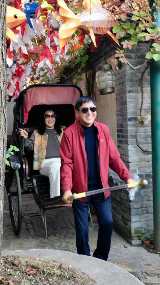 这般美景与热闹人群,彻底点燃了大家的兴致。燕导、木导、华导和摄影师韩姐灵感迸发,一会儿指导九位“娘子军”在拱桥上鱼贯而下,一会儿编排姐妹们在厅堂前华丽转身,一会儿又出其不意地让大妈们学壁虎贴墙“蛙步斜行”,还借来人力车道具,让同行夫妻扮演“骆驼祥子拉虎妞”。临时“摄影师”寒流大哥忙得脚不沾地,却乐在其中。一路上,花是景、画是景、船是景、桥是景,就连砖瓦草木、街角慵懒的猫咪,都成了镜头里的主角。“导演们”笑得开怀,“演员们”玩得尽兴,六个随行的大老爷们也被感染,跟着拍手叫好,欢呼声此起彼伏。