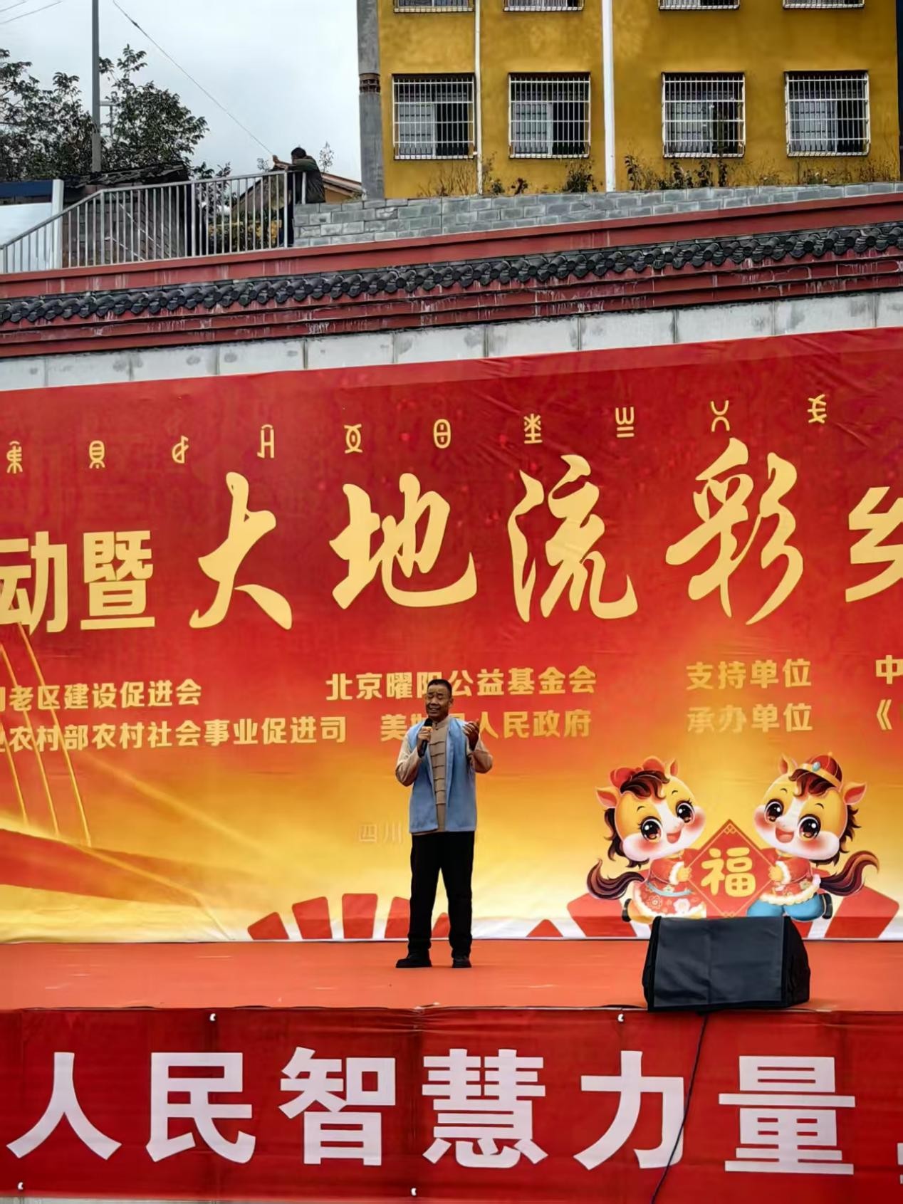 美姑县委副书记、县长朱华在致辞中对远道而来的公益团队表示衷心感谢,并介绍了美姑县在经济社会发展,尤其是在改善民生、推进健康美姑建设方面所做的努力。他说:“今天,北京曜阳公益基金会带来的慰问金与生活物资,是对“一老一小”急难愁盼的精准回应,为我们的民生保障网织密了温暖的一针一线;大地流彩乡情艺术团远道而来的演出,将把党和社会的关怀化作听得懂、看得见的文化暖流。这份“物质帮扶+精神慰藉”的双重馈赠,正是“民生无小事,枝叶总关情”的生动诠释。这份相聚的暖意,藏着三重深厚情谊: