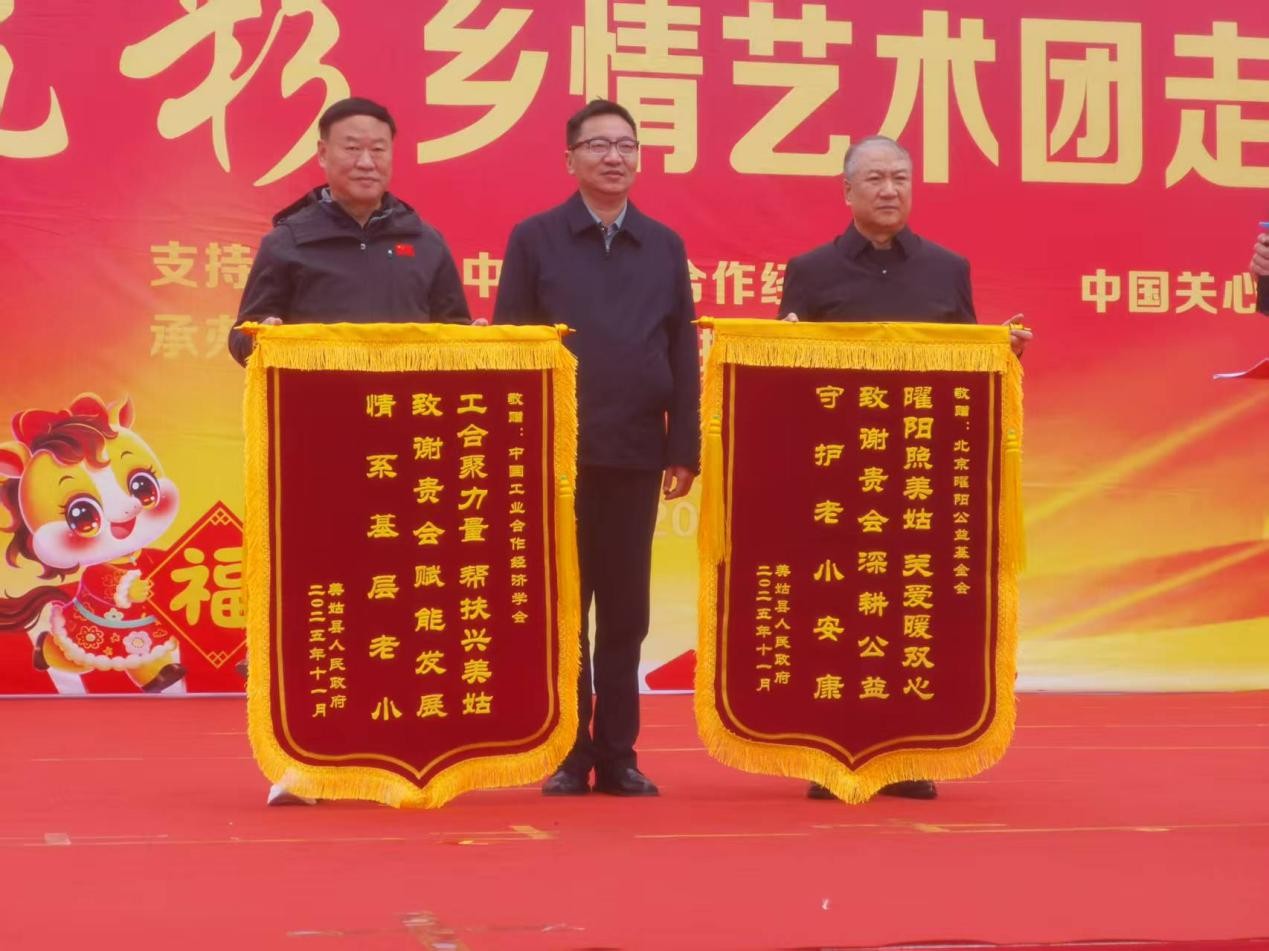 美姑县向北京曜阳公益基金会和中国工业合作经济学会赠旗