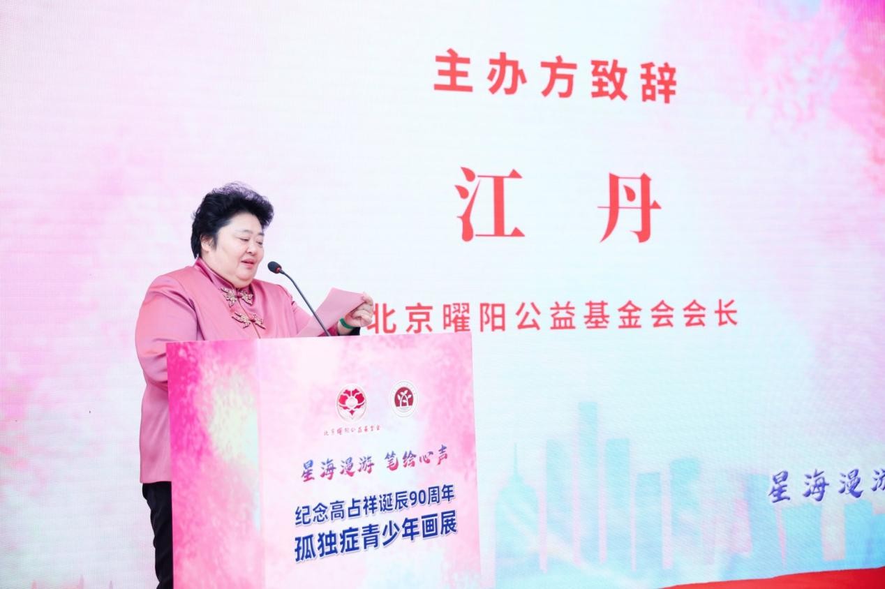 北京曜阳公益基金会会长江丹在讲话中说:“今天,我们怀着无比崇敬的心情,齐聚一堂,共同参加 “纪念高占祥诞辰 90 周年孤独症青少年画展”。此刻,一幅幅色彩斑斓的画作,不仅承载着 “星星的孩子” 们纯粹的心灵,更凝结着我们对高占祥同志的深切缅怀与崇高敬意。”“在公益领域,高占祥同志是“大爱无疆”的生动典范。他始终心系弱势群体,将公益视为责任与使命,积极投身扶贫济困、助学助残等各类公益事业。他关注特殊儿童的成长困境,呼吁社会给予更多包容与支持;他倡导 “公益不分大小,人人皆可参与”,用自身影响力凝聚社会爱心力量,推动形成互助友爱的社会风尚。”
