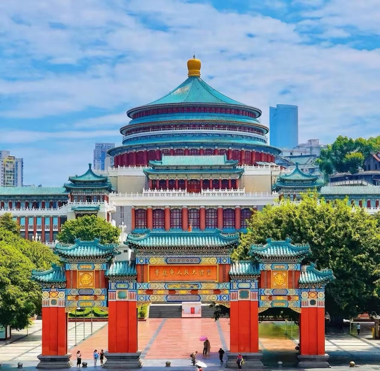 采风的行程是从人民广场开始的。人民广场是重庆的标志,也是西南历史的见证,广场从建设至今天已经70多年的历史。它既是新政权的象征,也是重庆发展的亲历者。广场是由三峡博物馆、重庆市人民大礼堂及两侧街道环绕而成,广场中间耸立着三门排楼,上书“重庆市人民大礼堂”,庄严沉稳、极具时代感。广场在设计上颇具匠心,类似北京天坛的造型,既有古代宗教建筑的庄严,又给人一种深刻的时代象征,排楼雕栏画栋,琉璃飞檐,红墙绿顶,颇具皇家建筑特色,与大礼堂的金顶之下三层琉璃屋顶遥相呼应。礼堂两边各有一栋辅楼陪衬,高低错落,颇具烘托效果,排楼的红墙与三峡博物馆正面的玻璃幕墙相映成晖,三者在中轴线上排成一列,像故宫的微缩景观。从广场拾级到大礼堂要经历86级台阶,分成四个层级,台阶中间是花圃绿植,四季常青;两边各有三盏廊灯,相嵌在正方形的水泥柱上。台阶与广场相接处是汉白玉的旗墩,旗杆上飘扬着中华人民共和国国旗,使广场与大礼堂显得更加庄重威严。