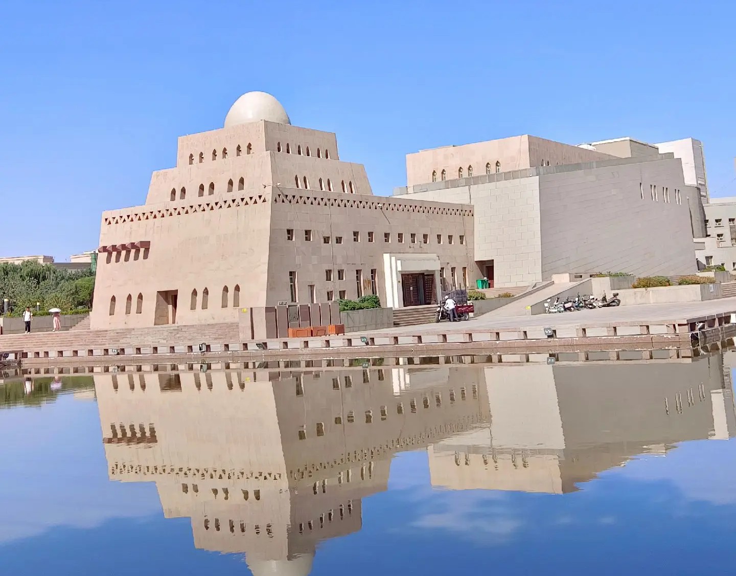 博物馆前有一大的水池,蓄有清澈的水。建筑物倒影在如镜的水中,恍如历史与现实的交融。博物馆大门左上方的外墙上,有楼兰美人浮雕。据说其原型是小河文化遗址那具楼兰美人干尸。深陷的眼窝,高挺的鼻梁,飘逸的裙裾,精巧而富有动感,微微侧着的身子,略略下倾的视线,她似乎正透过岁月的烟云,俯视着今日的盛世繁华。