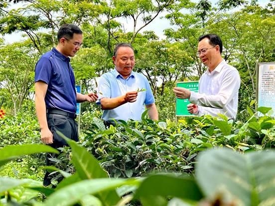 国家级中国茶文化首席非遗传承人·中国茶文化研究院院长罗大友(中)与地方领导在天子山茶区考察关于广东罗定天子茶