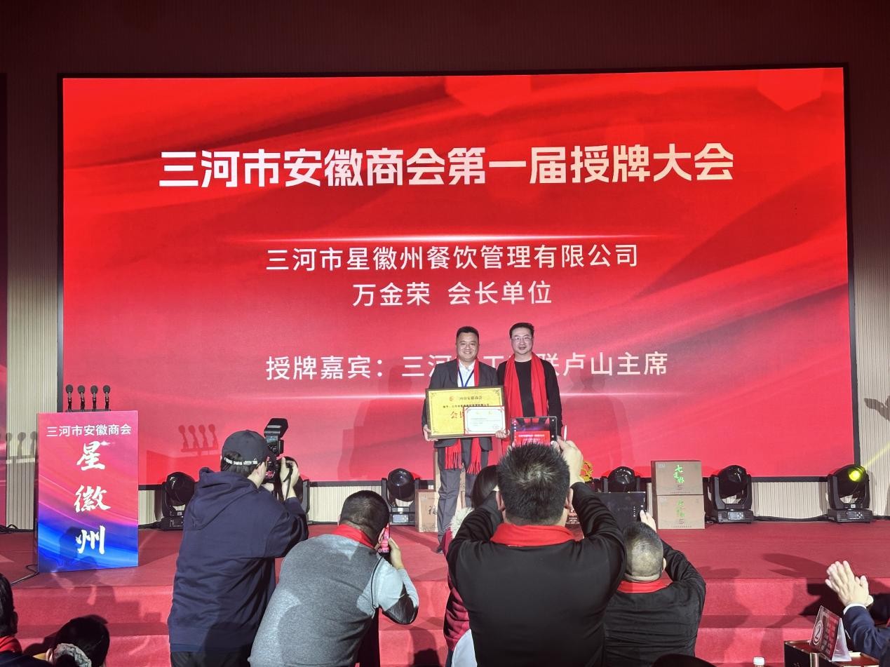 授牌仪式在庄严的国歌声中拉开帷幕,当三河市星徽餐饮管理有限公司董事长万金荣先生接过首届会长牌匾时,会场掌声如潮。这枚镌刻着责任与期许的牌匾,不仅预示着“徽商之星”将在燕赵大地熠熠生辉,更标志着在三河拼搏的万余名皖籍企业家从此有了共同的“娘家人”。