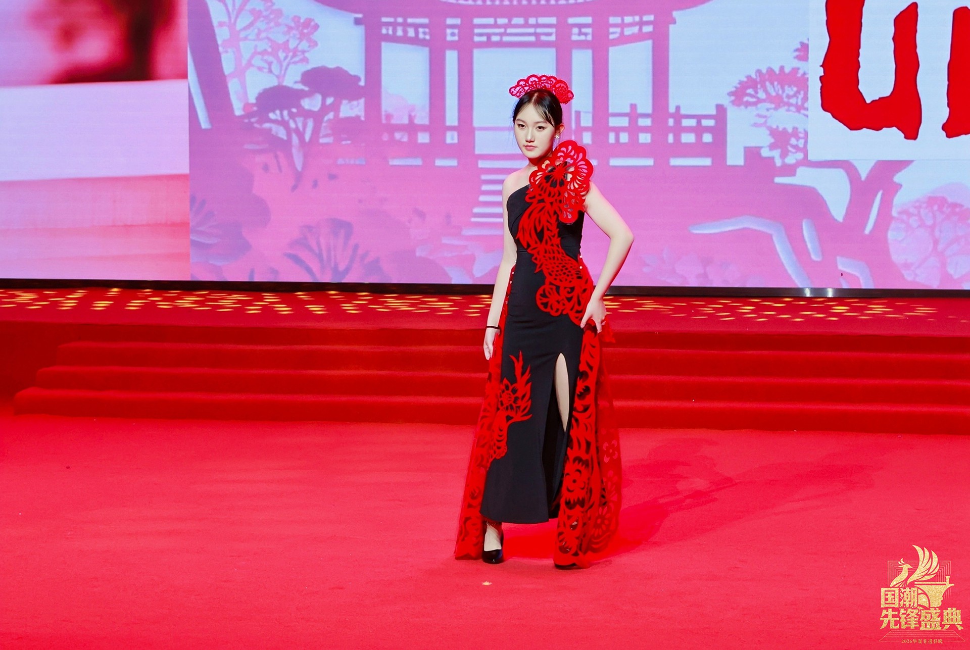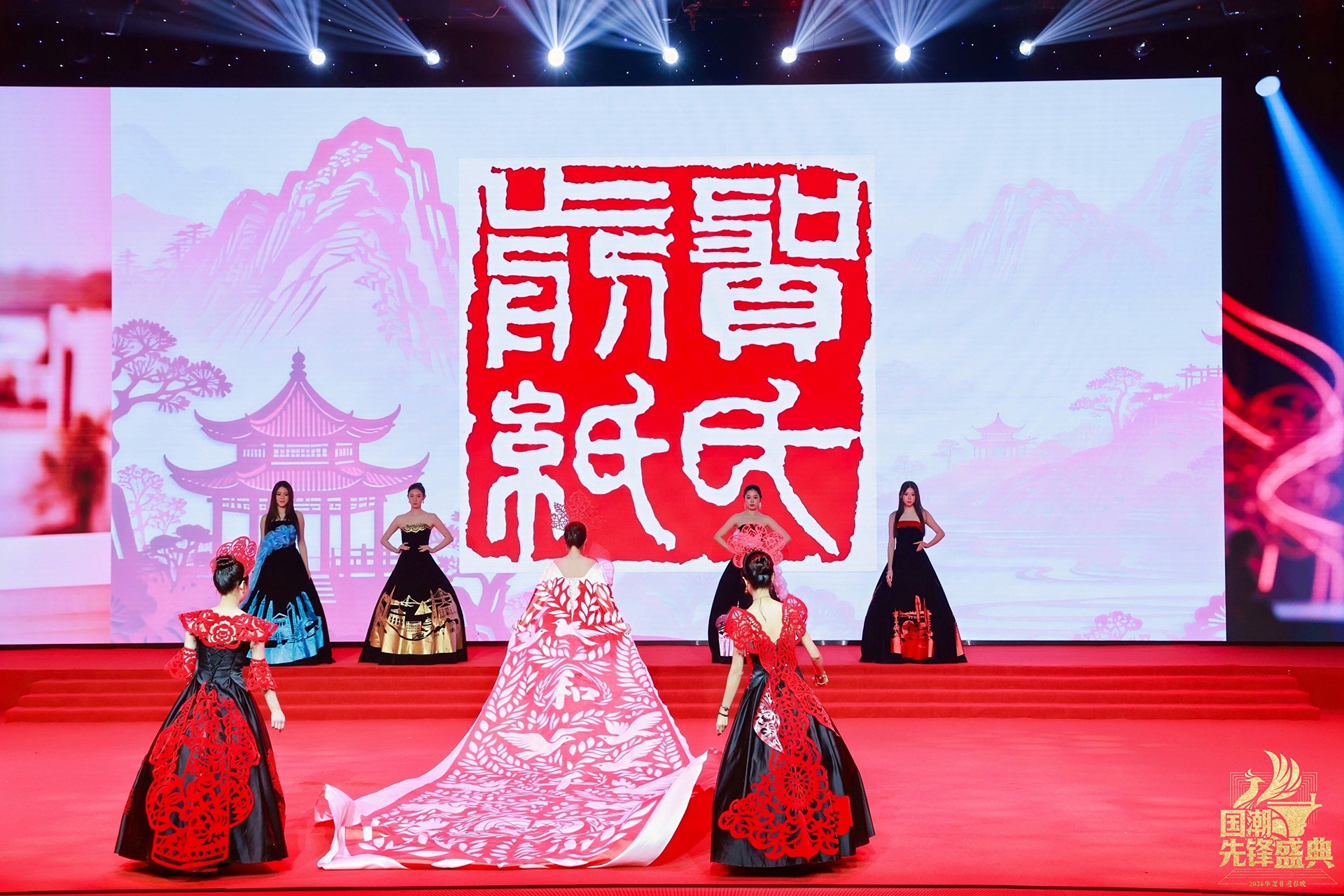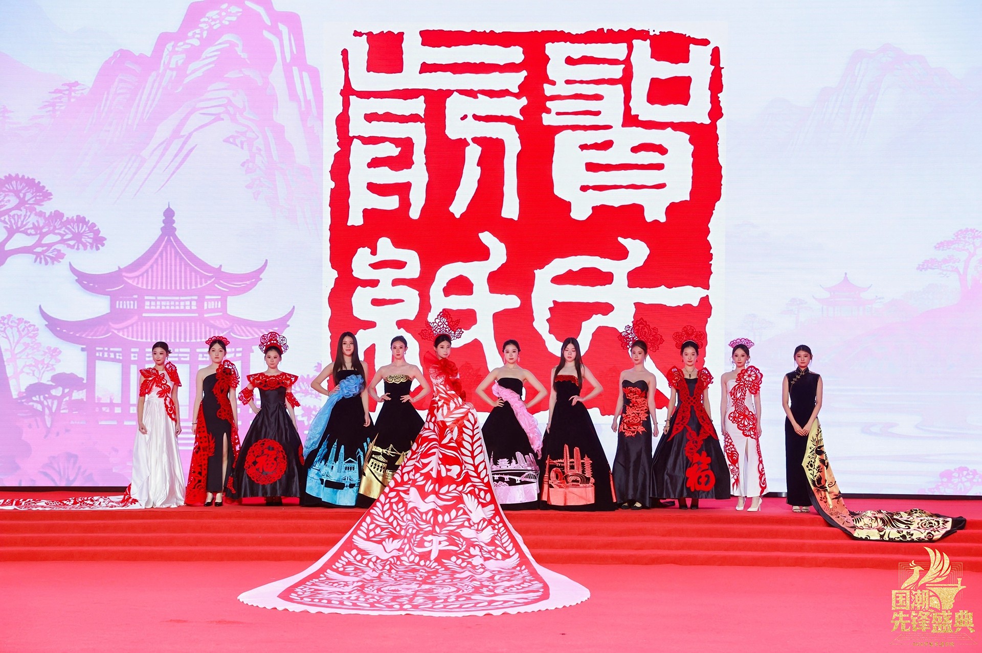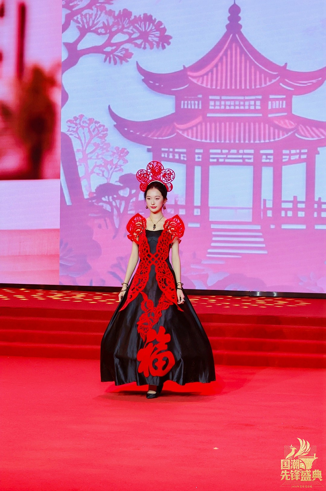 当“百鸟朝凤”系列亮相,整场秀迎来首个高潮。最繁复的镂空技艺化作羽翼的辉煌,凤凰的华美与百鸟的灵动在衣袂间交响,这不仅是视觉的盛宴,更是剪纸艺术“心手合一”的巅峰宣言。而岭南印象系列中,麒麟轮廓、荔枝红艳、碉楼光影被巧妙解构,让温婉又热烈的地域风情,在国潮画卷上留下清丽一笔。