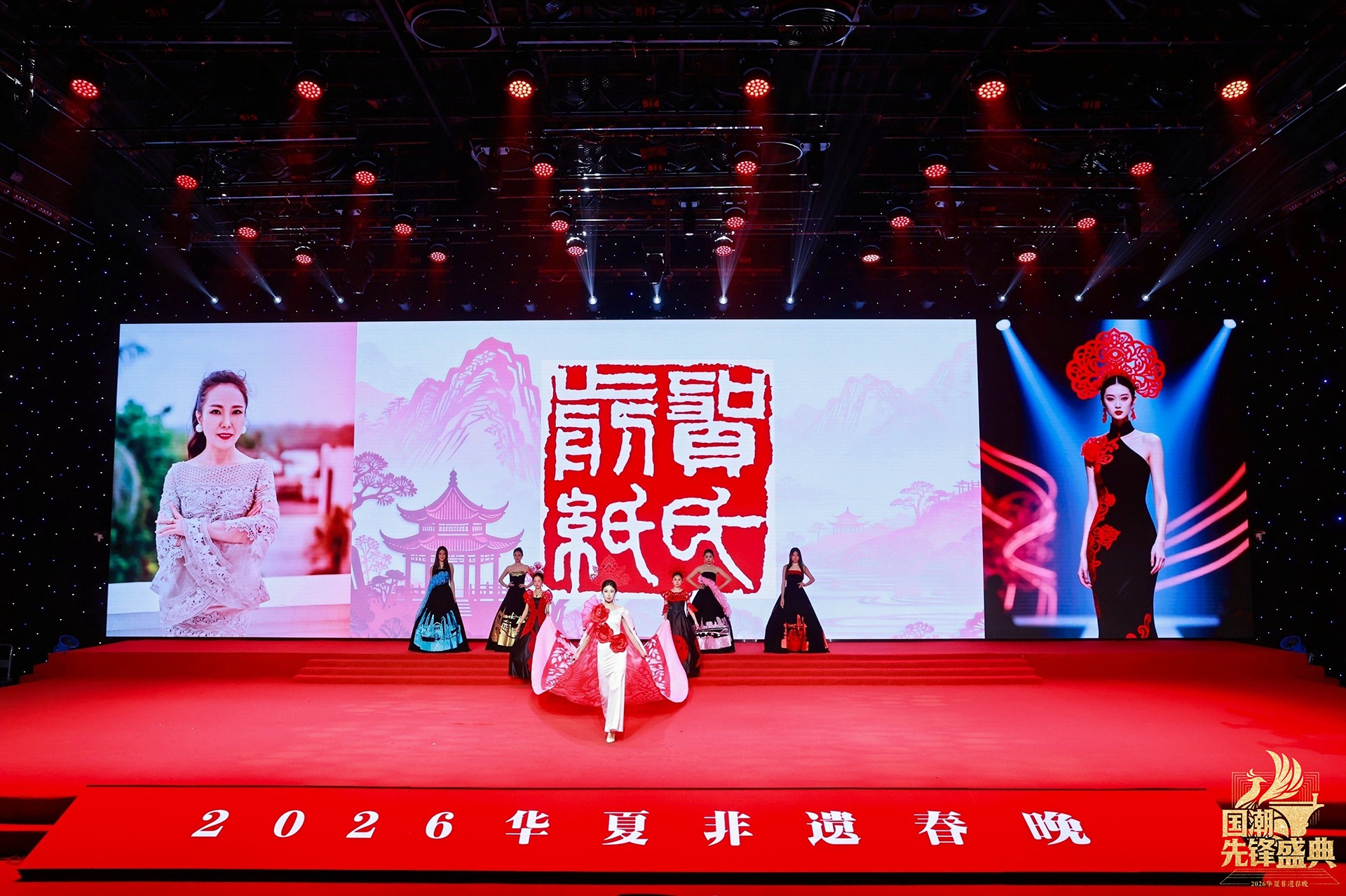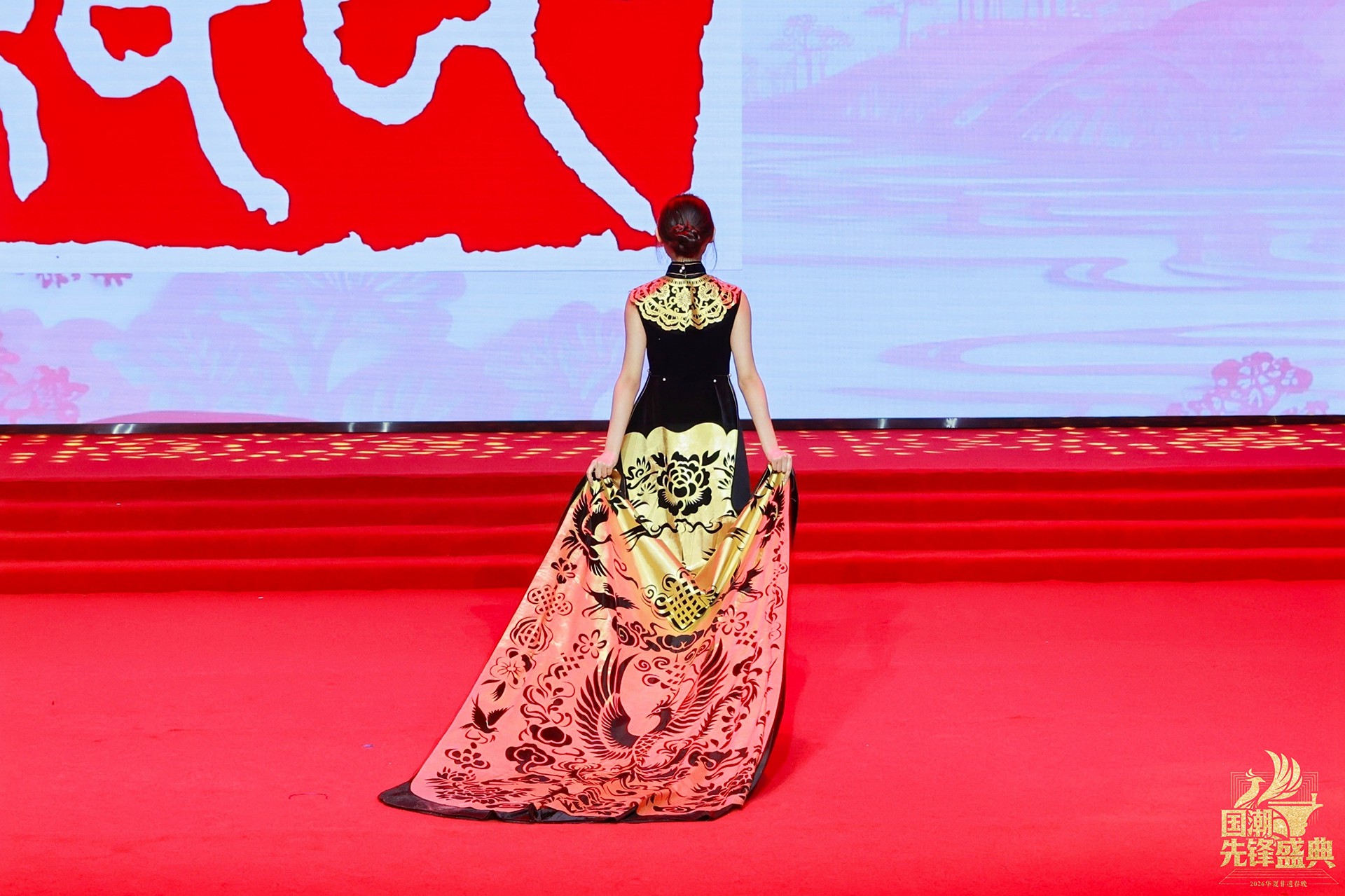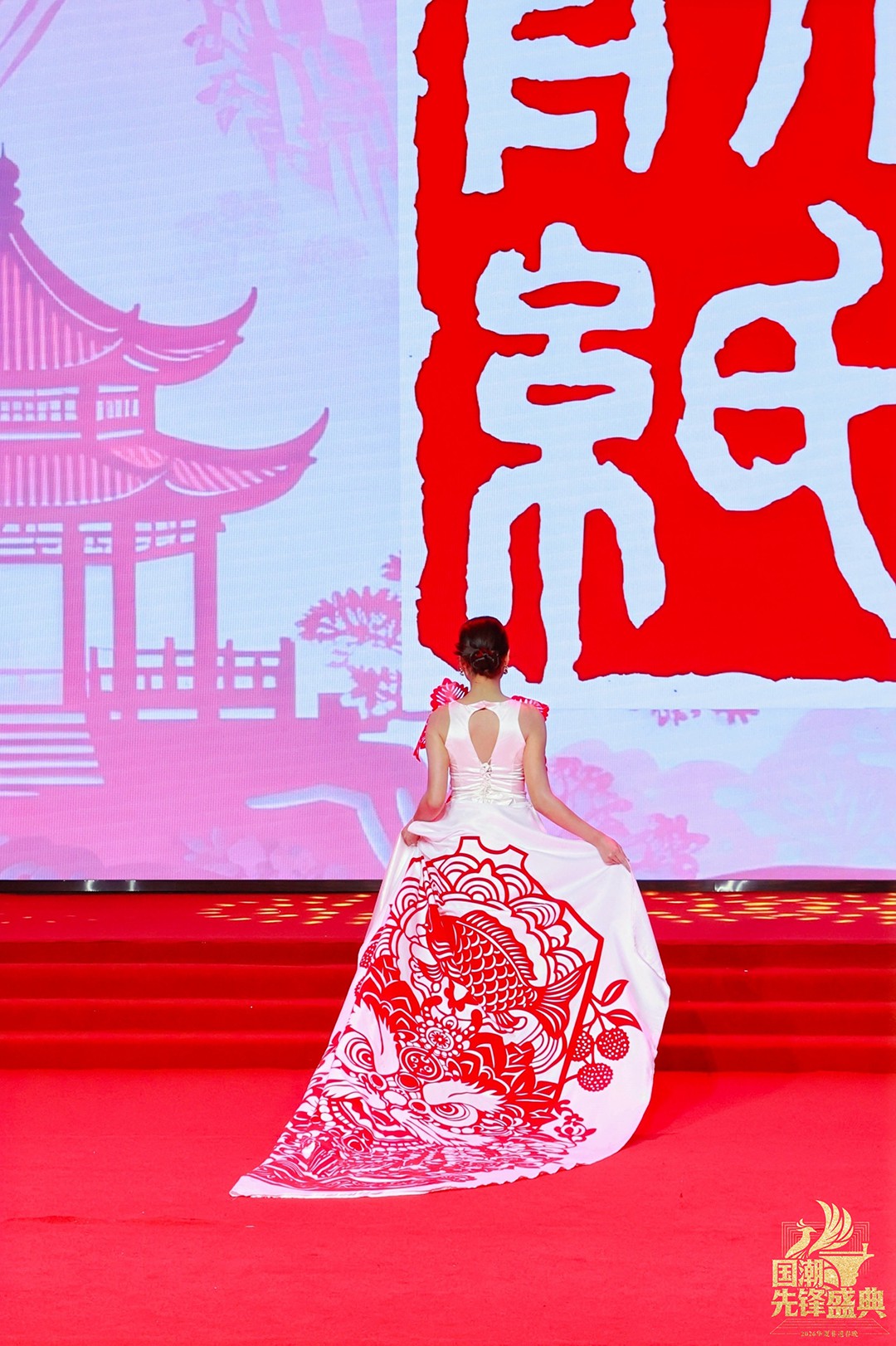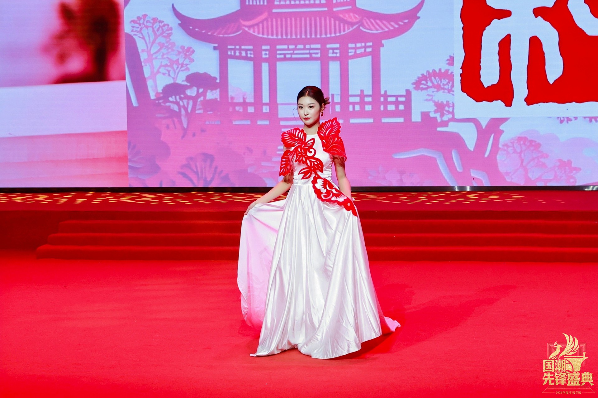 当“百鸟朝凤”系列亮相,整场秀迎来首个高潮。最繁复的镂空技艺化作羽翼的辉煌,凤凰的华美与百鸟的灵动在衣袂间交响,这不仅是视觉的盛宴,更是剪纸艺术“心手合一”的巅峰宣言。而岭南印象系列中,麒麟轮廓、荔枝红艳、碉楼光影被巧妙解构,让温婉又热烈的地域风情,在国潮画卷上留下清丽一笔。
