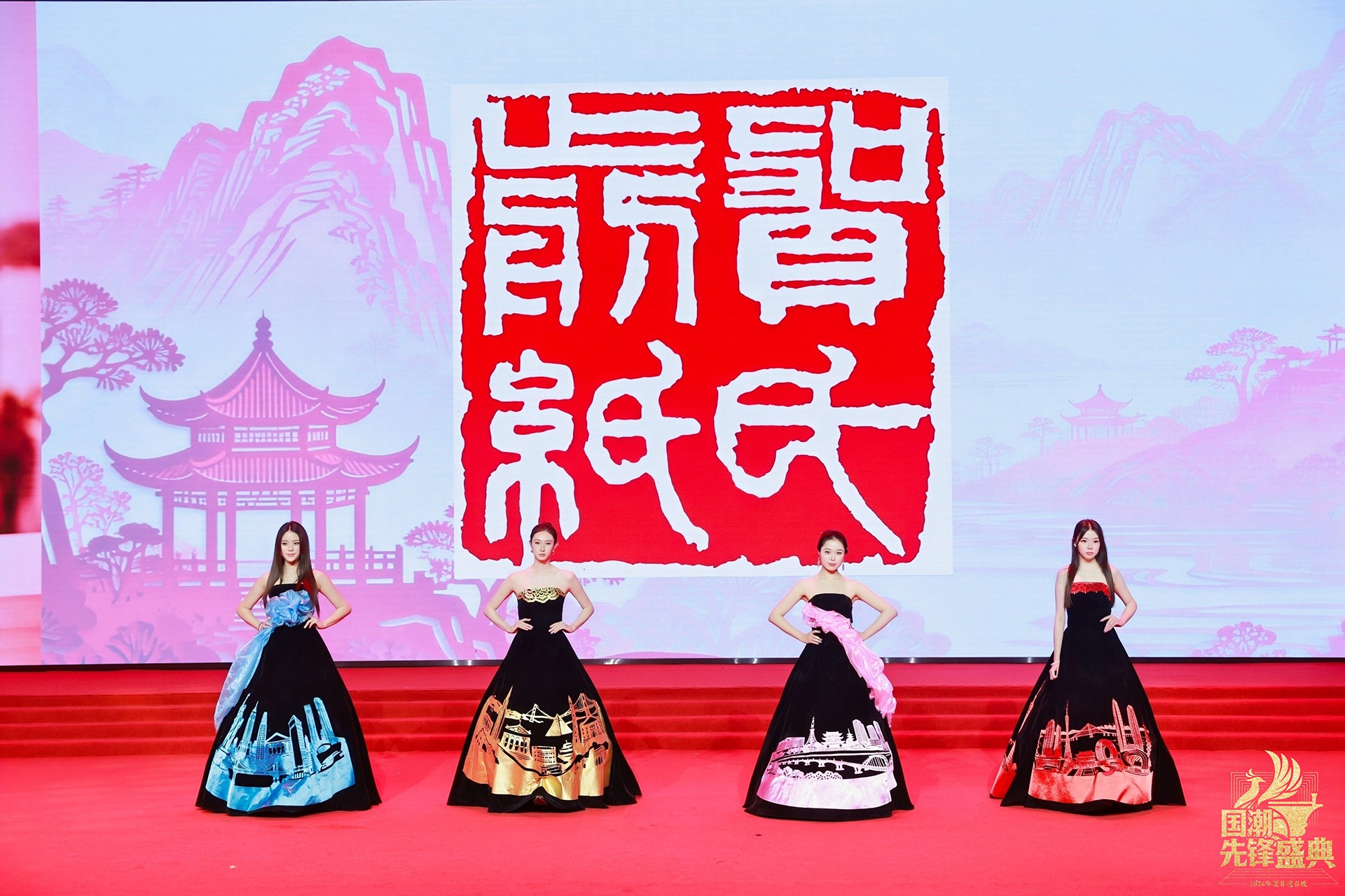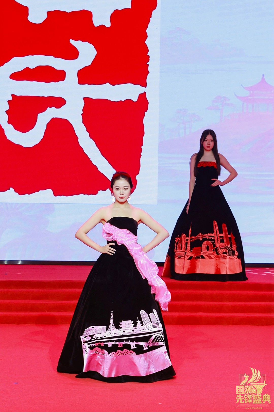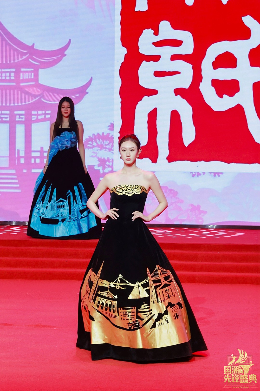 旧金山湾区的阳光化作金色光芒,剪纸线条变身为现代建筑的利落几何;东京湾的晨曦里,粉樱飘落的轨迹藏着东方美学的细腻;纽约湾的深邃夜色中,不对称剪裁演绎着都市的理性律动;最终,所有色彩汇入粤港澳大湾区的炽烈中国红——传统建筑肌理与未来感廓形碰撞,龙腾线条闪耀着“从制造到创造”的时代锋芒。