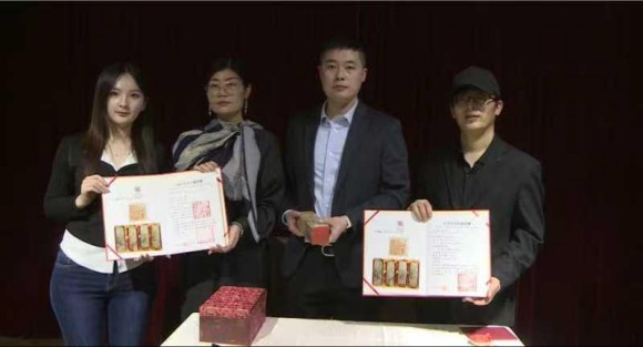 朱氏金石传承人朱德胜、朱艺轩与山东青年政治学院代表展示院印与收藏证书