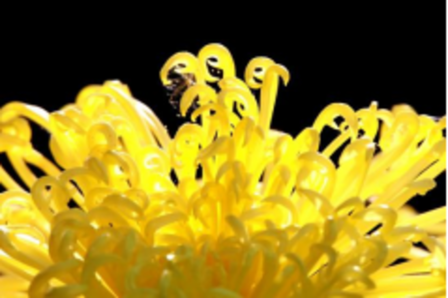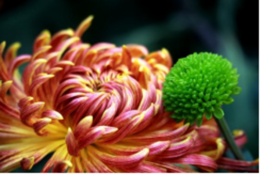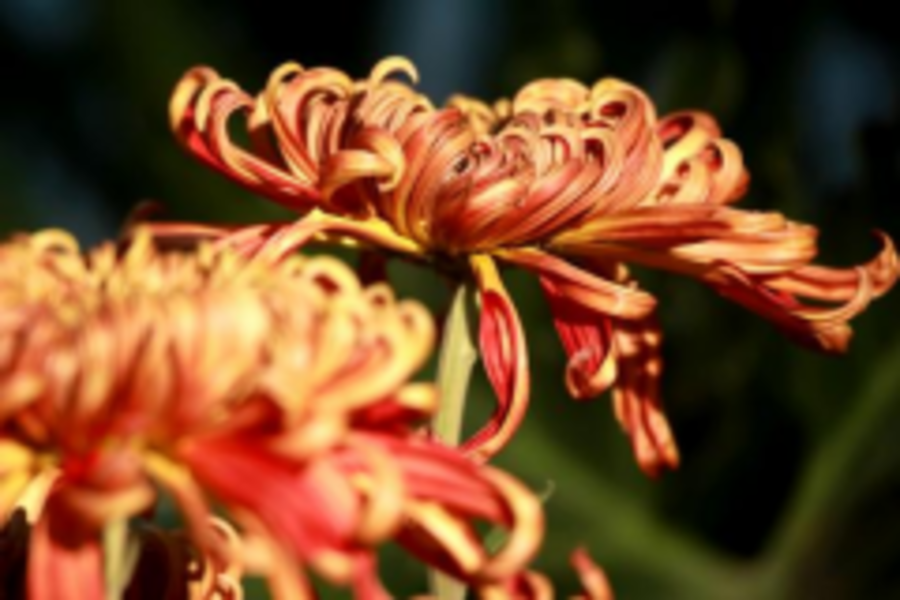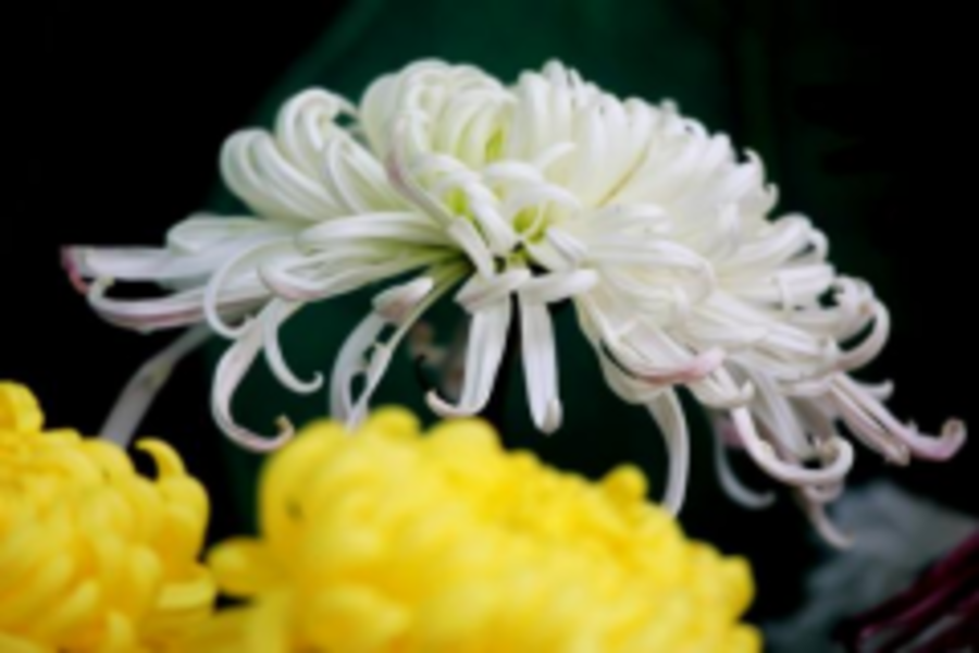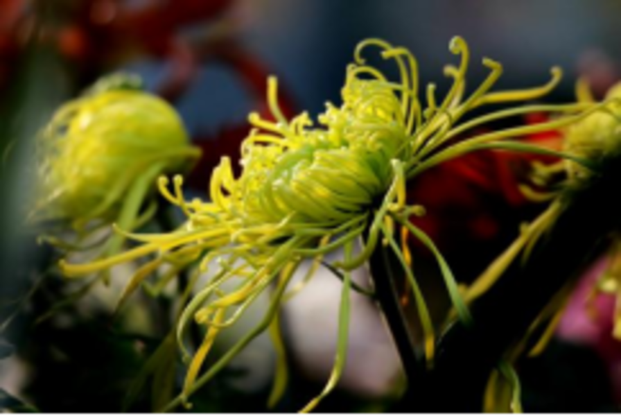 绚丽多彩的菊花颜色冲击着人们的视觉,红色似火,白色胜雪,黄色赛金;有的花朵很大很大,有的花朵却小巧玲龙,无数道丝状的花瓣金灿灿的,像豆芽,像松针,更像少女美丽的卷发。