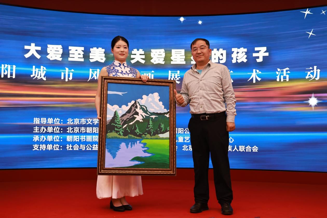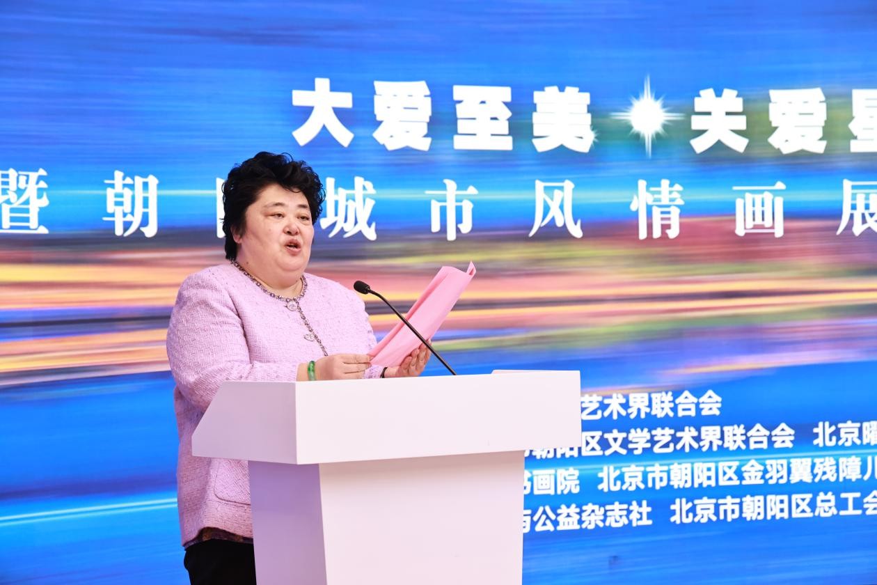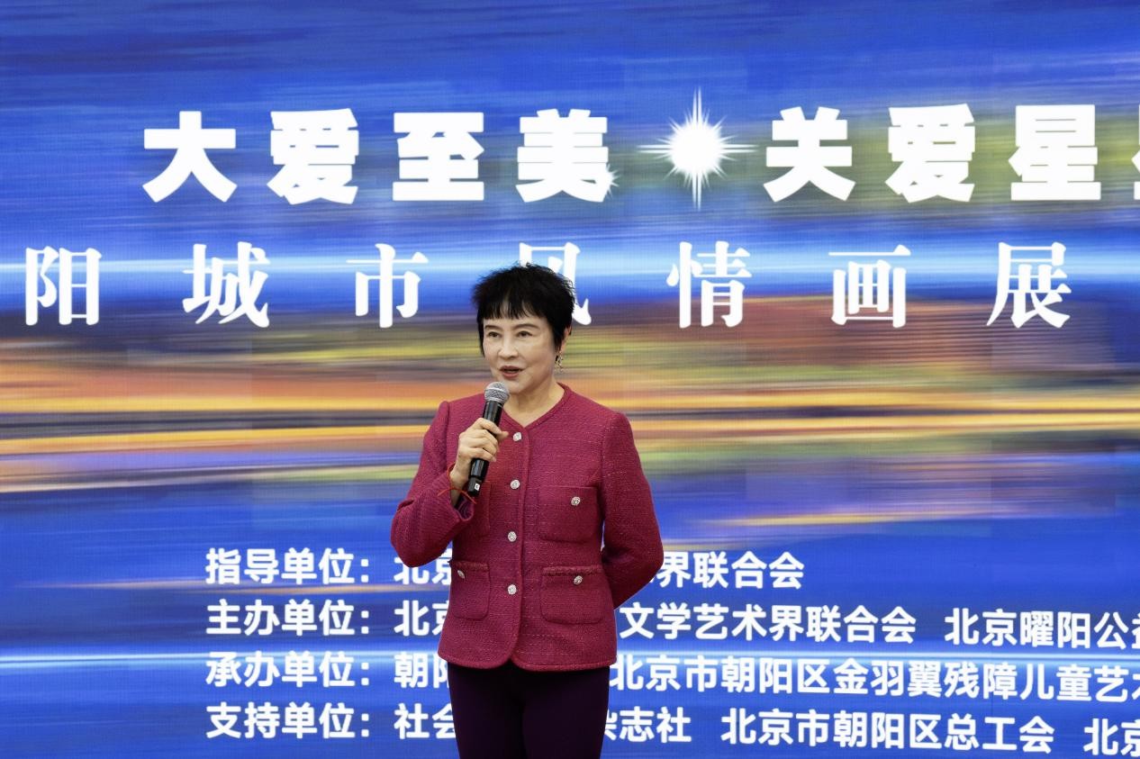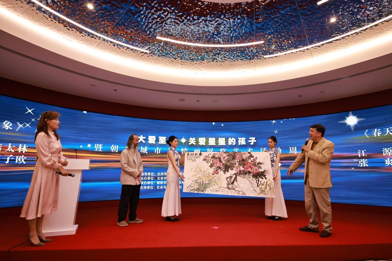 朝阳区文学艺术界联合会党组书记杨立亭在致辞中说:艺术源于生活,更应反哺社会。今天,我们以“大爱至美”为主题,将朝阳城市风情画与“关爱星星的孩子”公益活动创新结合,是一次“文艺+公益”深度融合的探索与实践。我们希望通过艺术的桥梁,提高公众对孤独症群体的认知,让更多人从孩子们的画作中看到温暖,看到希望,看到力量。