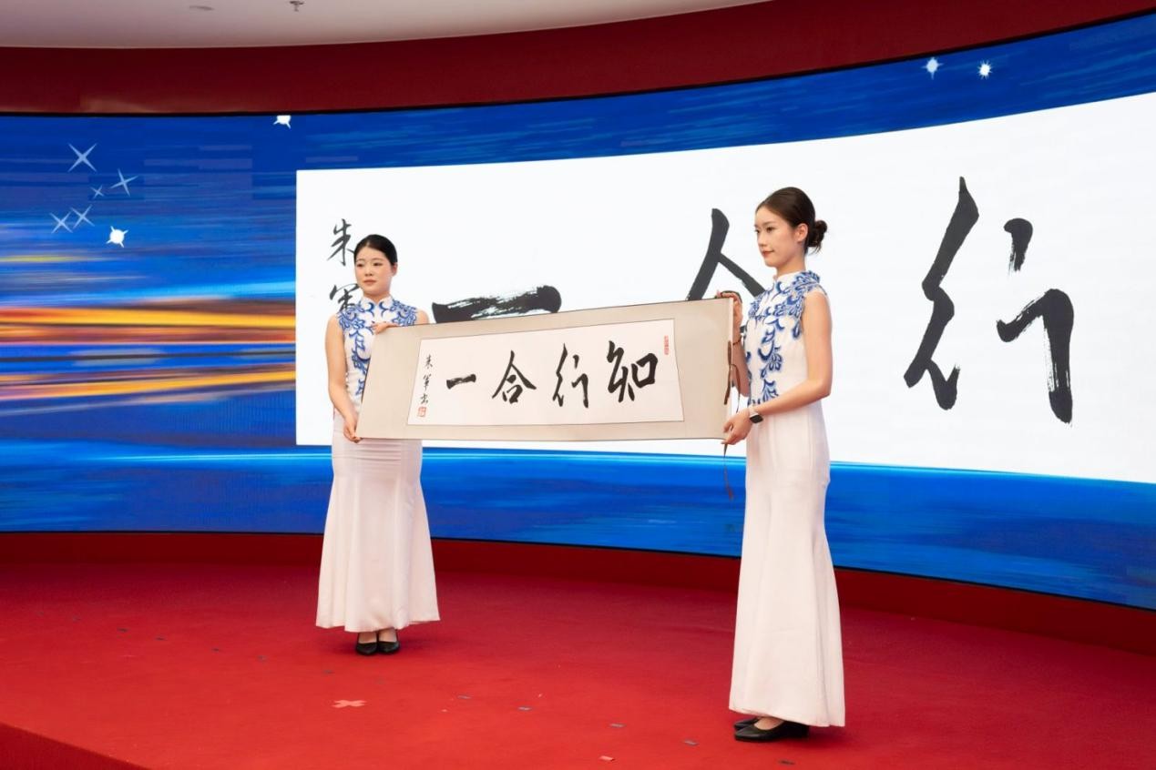 开幕式现场,爱心大使朱军书法作品《知行合一》、著名书画家陈忠洲画作《旭日东升》、著名画家耿安辉先生山水画《松风一曲带清音》,他们都以捐赠的形式表达对孤独症孩子温情关爱和对公益事业的强力支持。