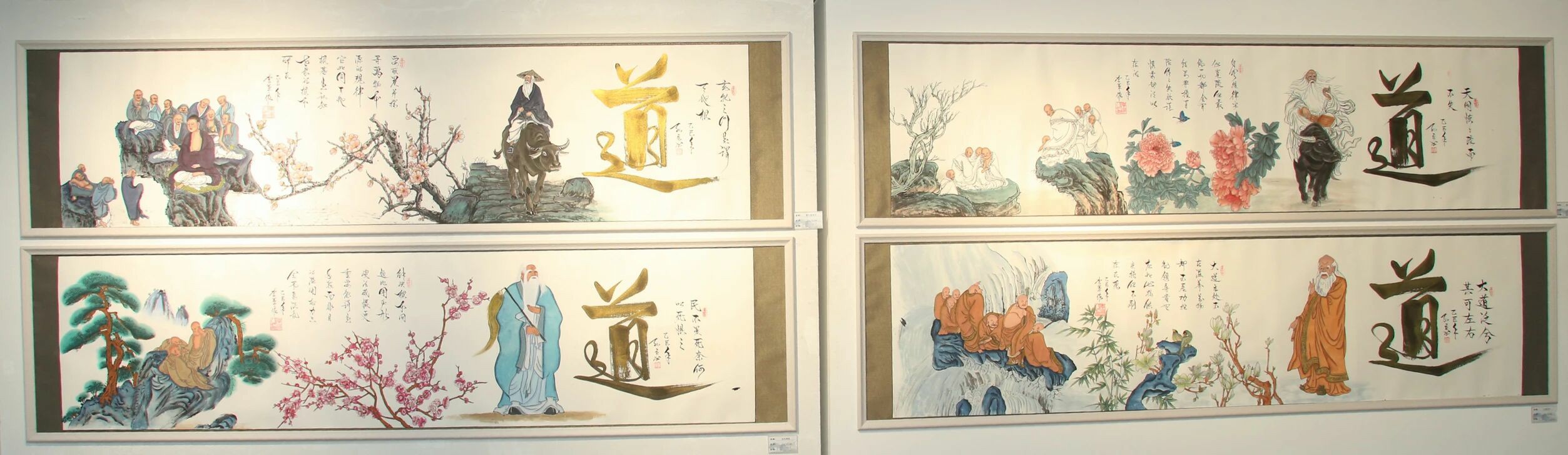 本次展览精心策划“道法自然”“伟业新篇”“铁血丰碑”“水墨千秋”“般若之光”五大板块,既独立成韵又脉络相连,构成一幅立体的文化长卷。“道法自然”板块中,笔墨间流淌着老子哲学的深邃,勾勒出东方宇宙观的空灵意境;“伟业新篇”以时代笔触回望中国道路的探索光辉,传递出昂扬向上的时代气息;“铁血丰碑”通过书画艺术铭刻抗美援朝精神,致敬坚贞不屈的民族气节;“水墨千秋”在山水花鸟间延续文人意趣,让传统美学在当代焕发生机;“般若之光”则绘写佛教中国化的慈悲智慧,为观者照见心灵净土。
